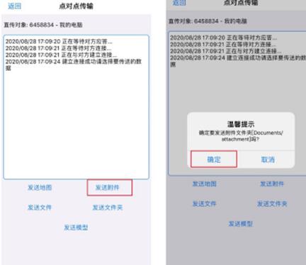 在手机端[点对点传输]页面,点击【发送附件】,弹出提示“确定发送附件文件夹[Documents/attachment]吗?”,点击【确定】。