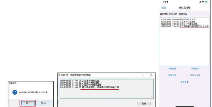 同时,电脑端(或对应的好友)弹出提示“请求点对点传输”,点击【是】,等待[点对点传输]界面提示“建立连接成功”。