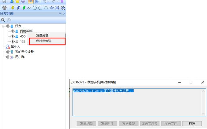 发送者在电脑端[好友列表]中找到【我的手机】(或者对应的好友),鼠标右键,选择【点对点传输】。地图界面会弹出[点对点传输]界面。