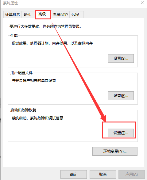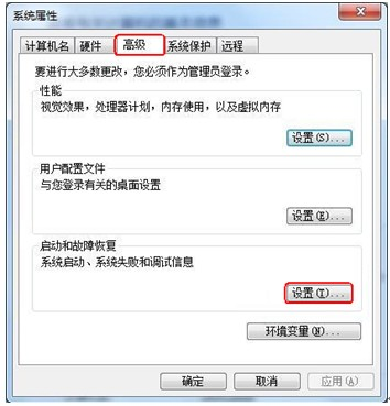 2,然后将窗口切换到“高级”选项栏中,在页面下方“启动和故障恢复”区域点击设置选项。