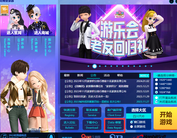 1,我们可以在登录界面上点击下图红色方框中的“Data修复”选项,劲舞团游戏是为玩家提供了免费修复功能的,修复以后重启劲舞团客户端,再进行登录即可。
