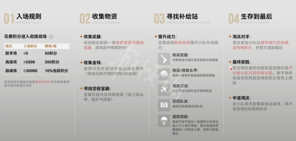 3,而且游戏会根据携带武器和配件的评分来进行智能匹配分级,让同一武器等级的玩家匹配到一起,如果你携带的武器越高级,所匹配到的玩家也越厉害,地图里的物资也会更丰厚,获胜难度也就更大,但是获胜的奖励也更诱人。