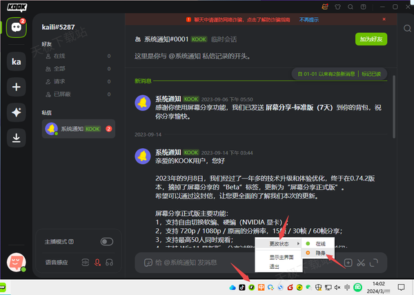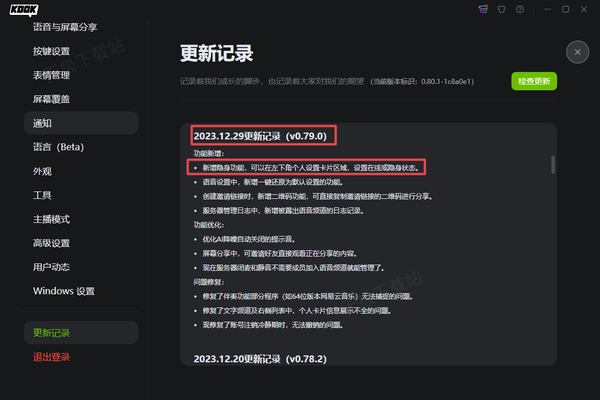 根据查找到的资料来看,KOOK电脑版找不到隐身状态一般是由于软件版本过低造成的,因为这个隐身模式是KOOK在去年年底的v0.79.0版本中新增加的功能,如果自己电脑端的软件低于此版本的话,去官网或在本站下载软件的最新安装包,然后将软件升级至最新版本,即可找到隐身模式了。