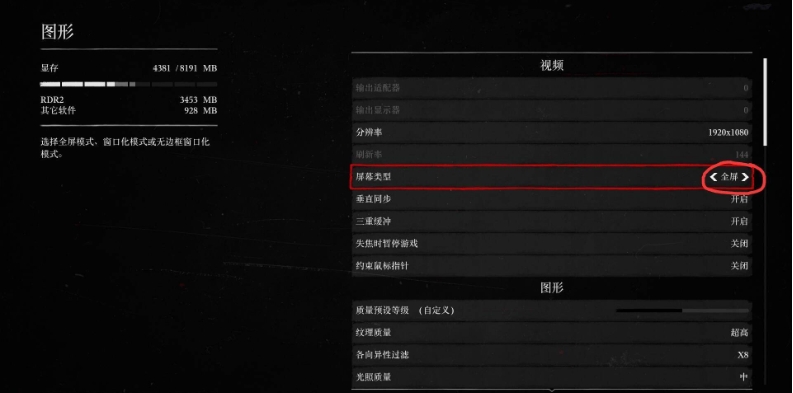 3、将屏幕类型设置为“全屏”或“无边框窗口”。