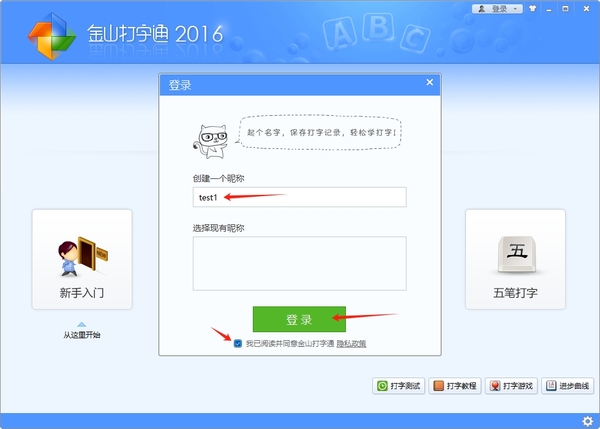 如果第一次使用金山打字通,我们需要先建立一个昵称,其操作类似于游戏里创建角色一样;