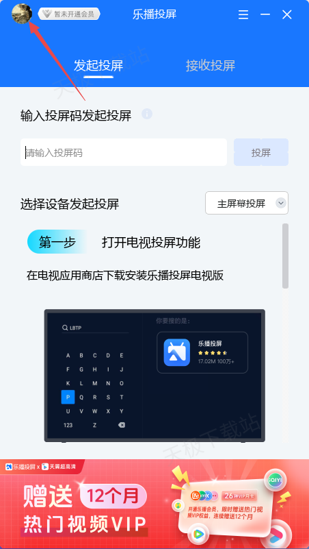 1、启动PC端的乐播投屏软件,然后登录自己的账号。然后点击软件左上角的【个人头像】图标。