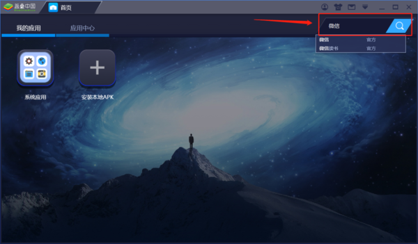 打开蓝叠模拟器之后我们在右上放的输入框中输入“微信”,然后按下回车键来搜索软件。