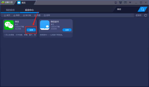软件搜索出来后,我们再出现的软件列表中找到我们需要安装的微信,点击“安装”,这个时候微信就会开始在蓝叠模拟器中开始安装了,安装完成后就可以用了。