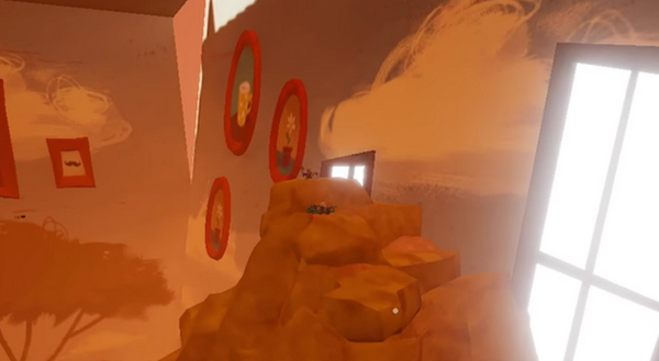 第一个玩偶在门口左手边的黄色桶上面。跳上边上的石头,然后就可以再跳上桶上面。