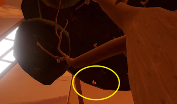 第六个玩偶如下图位置的树上。把石头扔向树以后,玩偶就会掉下来。