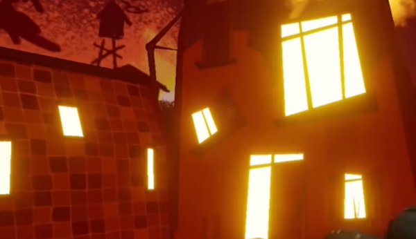 拿着刚才的罩子,回到这关游戏初始点的位置。可以看见边上有一个着火的水枪,把罩子盖住水枪,然后水枪的火就熄灭了。拿起水枪,同时边上还有个洗手台,用水枪吸水。带着水枪,跳上椅子,又爬上屋顶,从窗户又回到刚才的屋子里面。可以看见有个管道着火了,用水枪把火扑灭,启动管道。然后顺着楼梯爬上屋顶,可以看见有个孔喷气了。利用喷气孔到达另一边,有个门的屋顶。打开门,跳下去。进入房间后拿一个垫子。出口在斜立着的垫子的后面。出来后找到如下图的高楼,把垫子放在门口,就可以看见有3个娃娃掉下来了。靠近高楼的时候,左上角也有图案提示的。