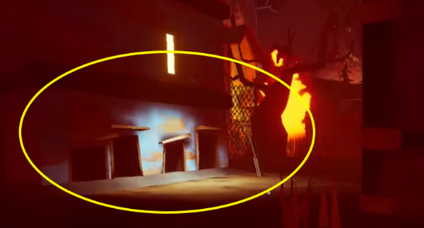 回到餐桌那边,可以看见一个很大的玩偶。走到如图的位置,然后跳上大玩偶身上,玩偶就会移动了。这个位置比较偏,要好好找。大玩偶会移动到蓝色门的高楼的头顶,然后放水下来把火熄灭。这个时候就可以去把娃娃捡起来了。