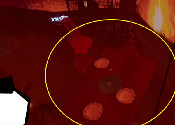 还是回到刚才有块木板的屋顶上,顺着路走,但是这次不从窗户进屋里面了。而是跳到另一面墙的木板上。顺着路走,就可以看见一个餐桌。拿起餐桌上如下图标记的罩子,可以发现一个娃娃。同时拿起罩子,把罩子带走。