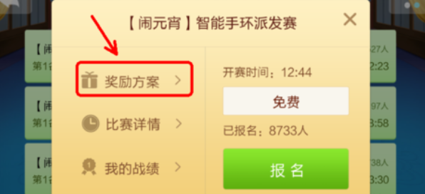 3,在报名界面中还可以看到奖励方案、比赛详情和开赛时间以及已经报名的人数,在比赛详情中可以看到,只要进入前80名就可以获得30秋卡。