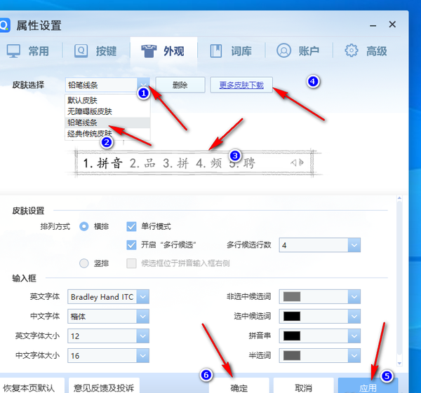 第四步,在外观设置窗口中如下图,可以看到“皮肤选择”的功能,点击旁边的箭头下拉菜单,就会出现多种皮肤样式供你选择。同时还可以点击页面中的“更多皮肤下载”来进行挑选更多的样式,全部选择好以后,不要忘记点击窗口最下方的“确定”选项哦。