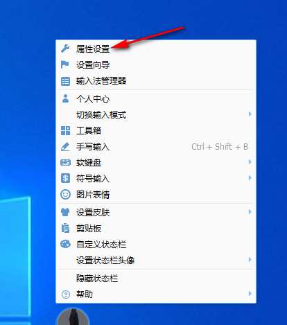 第二步,当桌面右下角出现QQ拼音输入法以后,将鼠标光标放置在上面,点击右键,在弹出的小菜单中点击第一个“属性设置”按钮。