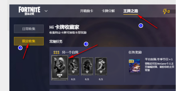 6、还有一种方法,我们进入到王牌之路的页面以后,在这个页面找到“限定收集”的功能,点击之后打开自己还没有拥有的卡牌,然后进入到卡牌的详情页就可以查看获得卡牌的任务是什么了,完成这个卡牌任务就可以获得对应的卡牌。