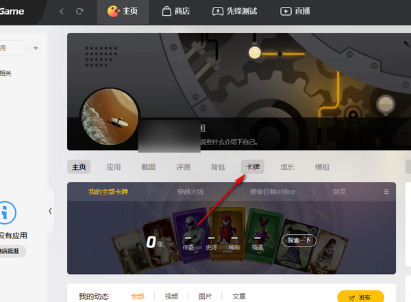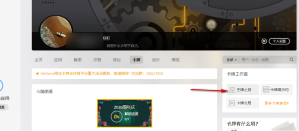 3、如下图所示,在个人主页的窗口中,在第一行的选项卡中找到“卡牌”这个功能,切换到这个页面来。