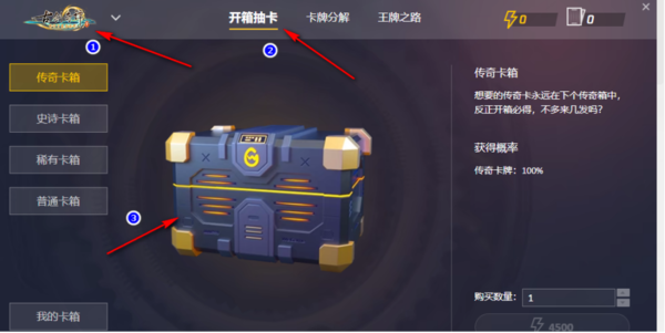 5、来到王牌之路的页面,在这个窗口中先使用鼠标点击左上方的游戏图标,来选择自己需要收集卡牌的游戏,然后再点击“开箱抽卡”这个按钮来购买卡箱就可以进行抽卡了,抽卡的奖励就可以获得卡牌。具体步骤可以参考下图。
