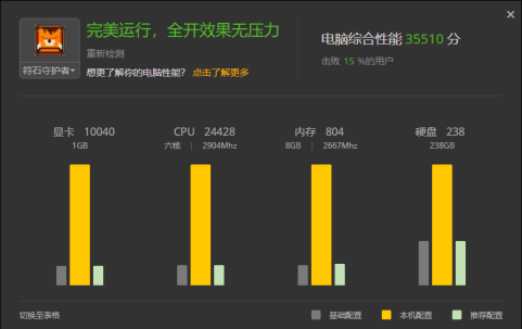 五,下图就是硬件检测功能的工作界面,它可以实时的检测我们电脑设备的综合性能得分,以及显卡,CPU,内存和硬盘的情况,帮助我们对自己电脑有一个全方面的了解和分析,让你参考这些信息决定是否可以在你的电脑上安装大型网络游戏。