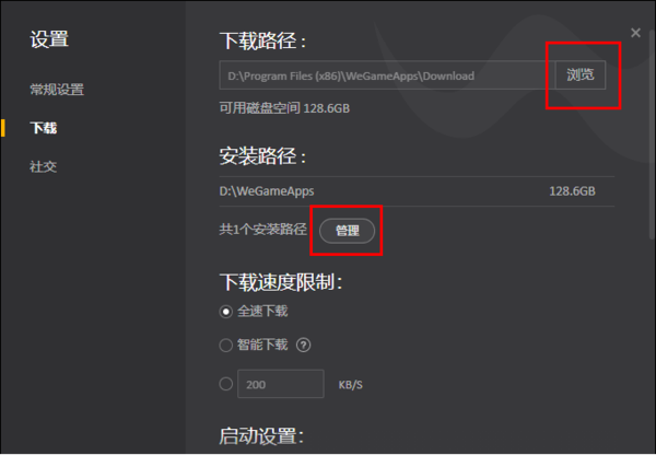 三,进入这个下载设置页面后,可以对下载安装的路径进行调整,比如说点击“浏览”按钮就可以修改游戏软件保存到电脑磁盘的对应位置,通过点击“管理”这个按钮,也可以修改安装的位置。