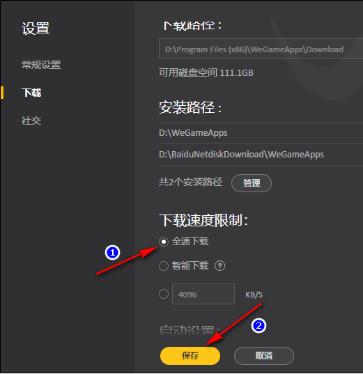 5、此时我们只需要把下载速度限制这个选项更改为全速下载,然后不要忘记点击最下方的“保存”按钮,就可以全速的下载了。除此之外,还可以进行智能下载或自定义设置下载的速度,这些都是腾讯wegame平台的方便之处。