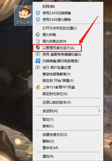 1、首先我们在电脑中找到欢乐斗地主的程序,然后对其右键点击,在出现的菜单列表中选择“以管理员身份运行”,这样我们就可以打开欢乐斗地主的程序了。