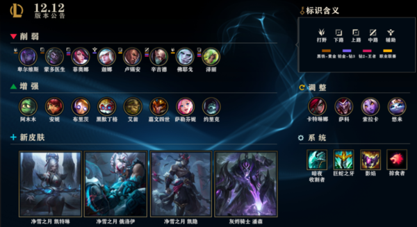 这次的12.12更新整体面向的就是英雄、装备的调整,以及蓝色精粹商店、皮肤上线。并且修复了一些上个版本中大部分的bug问题。