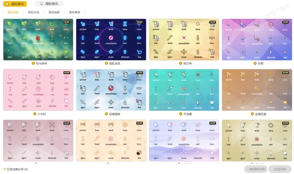 5.若你希望一步到位,获得一套完整协调的鼠标美化方案,可以选择“鼠标套装”。这里有多种预先设计好的精美套装供你选择,包括:鼠标皮肤、点击效果和鼠标拖尾,只需一键应用,即可快速实现个性化鼠标指针的配置。
