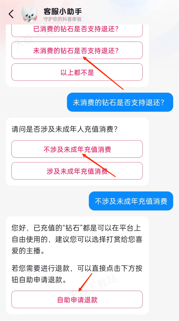 3、在客服界面中输入【钻石】并找到【钻石充值后如何退款?】的选项,点击它。接着,选择【未消费的钻石是否支持退还?】的选项,选择【不涉及未成年充值消费】选项,再选择【自动申请退款】按钮。