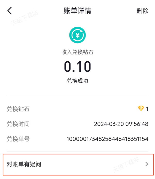 2、找到要退款的钻石订单,点击它。点击账单详情底部的【对账单有疑问】的选项。
