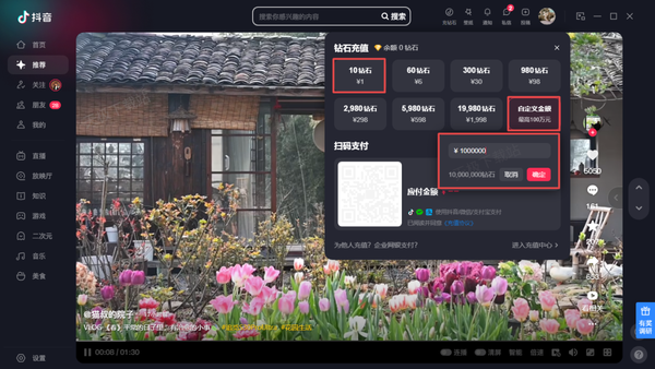 电脑抖音客户端的钻石自定义充值入口在什么地方
