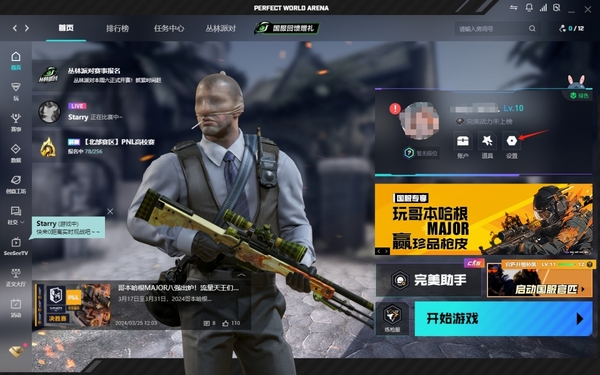 1、我们进入完美世界竞技平台,点击主界面右侧的【设置】按钮;
