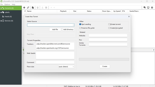 2、之后我们需要在弹出的界面中,填写select source(选择源)、torrent properties(bt属性)、other(其他)中的内容,之后点右下【create】即可新建Torrent,并开始下载。