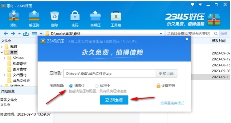 4、勾选压缩配置,可以选择【速度快】或者【体积小】,选择完毕后点击立即压缩。