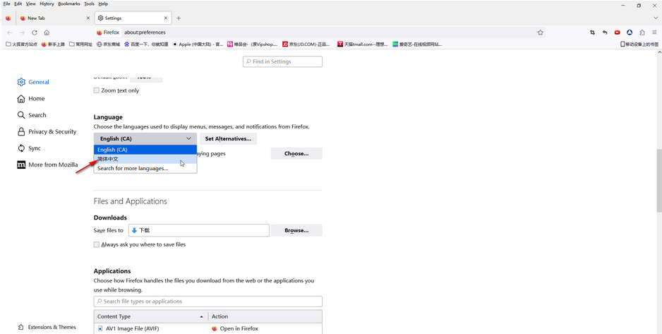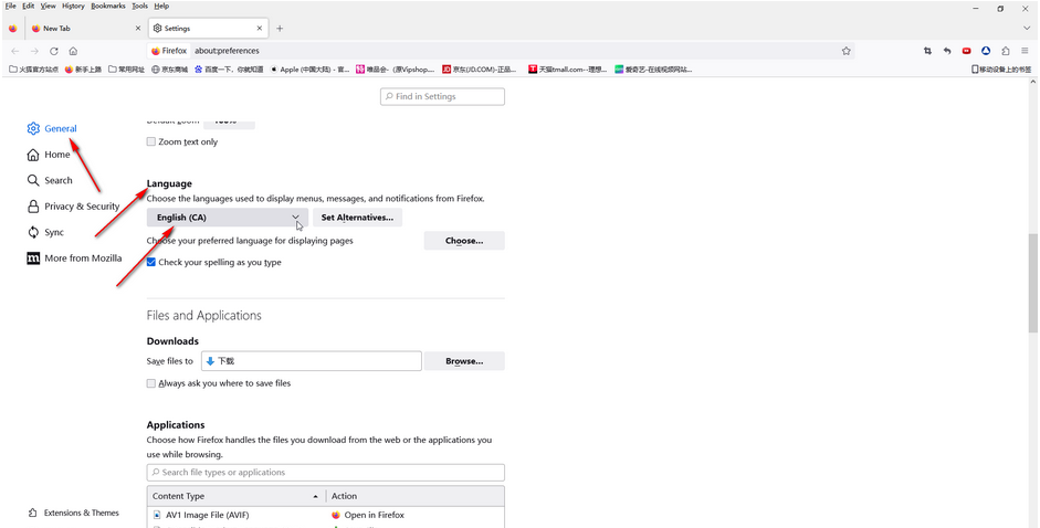 第三步:在新页面左侧点击切换到“general”(常规),然后往下滑动找到“language”(语言)栏,点击如图所示的语言处的下拉箭头;