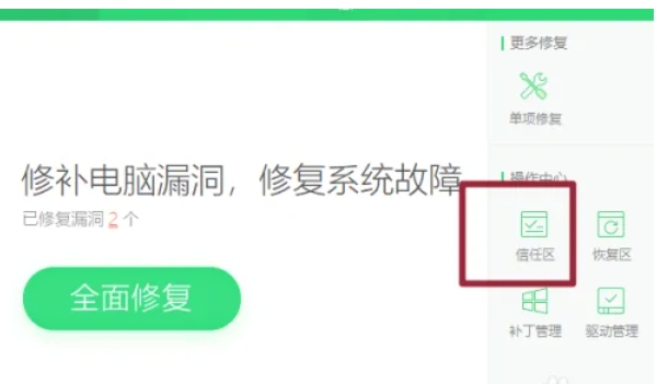 在操作中心里,需要用户找到“信任区”功能。这个信任区是360安全卫士用来存放用户认为安全的文件或软件的地方。