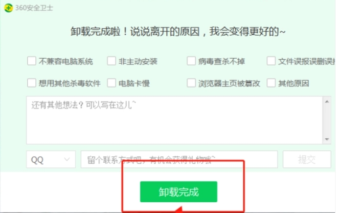 卸载完成后,会弹出一个窗口提示卸载完成。点击“卸载完成”或相应的按钮,关闭窗口,此时360安全卫士软件已经成功从系统中卸载。