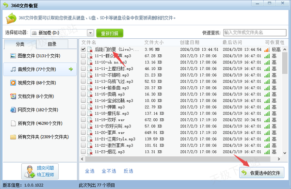 3、扫描完成后,在扫描出来的文件中,找到此前粉碎的文件,勾选它,然后选择【恢复选中的文件】按钮。