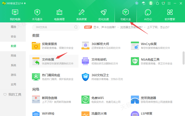 1、启动电脑中的360安全卫士软件,然后进入到【功能大全】界面当中,接着找到【文件恢复】功能,点击它。