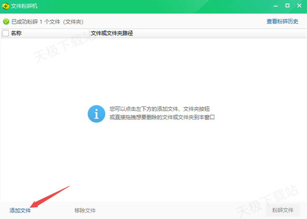 1、启动电脑中的360文件粉碎机,然后点击界面左下角的【添加文件】按钮,将需要粉碎的顽固文件添加进来,再或者是将文件直接拖拽到软件的空白处进行添加。