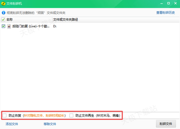 2、顽固文件添加好以后,大家可以根据自己的实际需求,来勾选【防止恢复】或【防止文件再生】的选项。