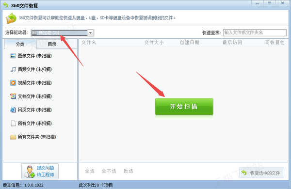 2、接着,在【选择驱动器】选项中,选择此前粉碎文件的路径,接着点击【开始扫描】按钮。