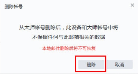 5、弹出删除账号的内容框,点击“删除”选项就可以,不过要注意删除之后本地邮件的相关数据将不保留,并且不可恢复,重要邮件建议提前备份。
