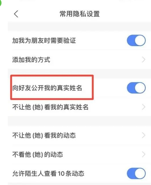 在常用隐私设置页面,您将看到各种隐私开关,包括“向好友公开我的真实姓名”。点击这个开关,将其关闭