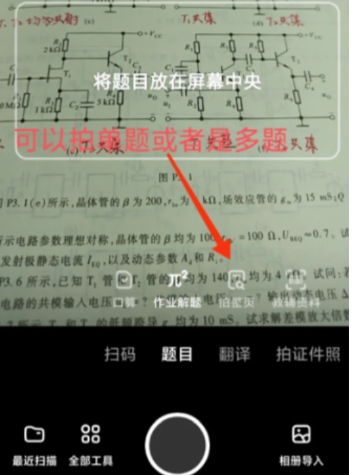 3、将需要解答的题目放在屏幕中央,拍照后即可解答。