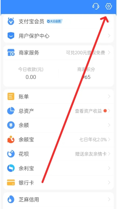 打开支付宝,进入“我的”页面,点击右上角的设置图标。