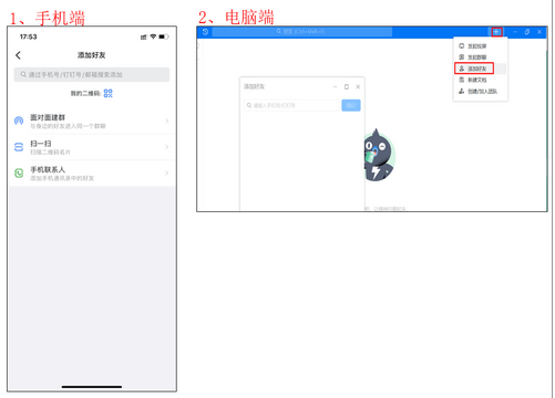 2、【电脑端钉钉】- 右上角【+】-【添加好友】- 输入【手机号/钉钉号】;或在消息页面上方输入手机号/钉钉号添加。