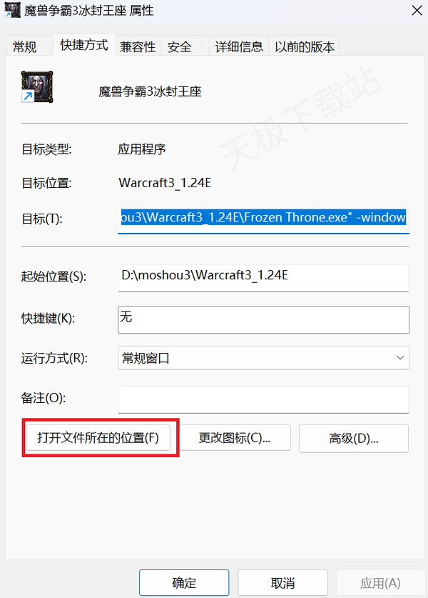 1.首先我们需要进入魔兽争霸3在电脑系统的安装目录,如果我们创建了魔兽争霸3的桌面快捷方式的话,直接右键选择“属性”,然后点击“打开文件夹所在位置”即可。