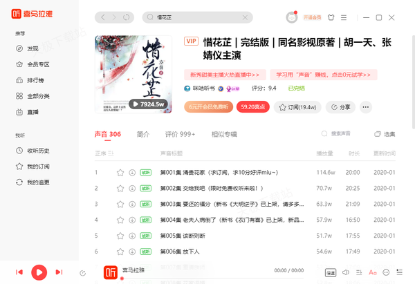 根据小编的亲自使用经验来看,惜花芷电视剧原著小说在酷狗音乐、酷我音乐以及QQ音乐这3个音乐软件上可以免费收听,同时在喜马拉雅这个平台上也可以收听,只不过该平台上收听该有声小说是需要付费的。